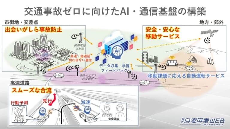 交通事故ゼロ社会の実現に向けた主な取り組みとして、死角のある交差点における出会いがしらの接触防止など「三位一体型インフラ協調」、大量の走行データに基づき、AI自らが学習するデータドリブンな「高度運転支援/将来的な自動運転システムの開発」、事故に繋がりうる危険行動を避けることを促す「AIエージェントの開発」が挙げられる。