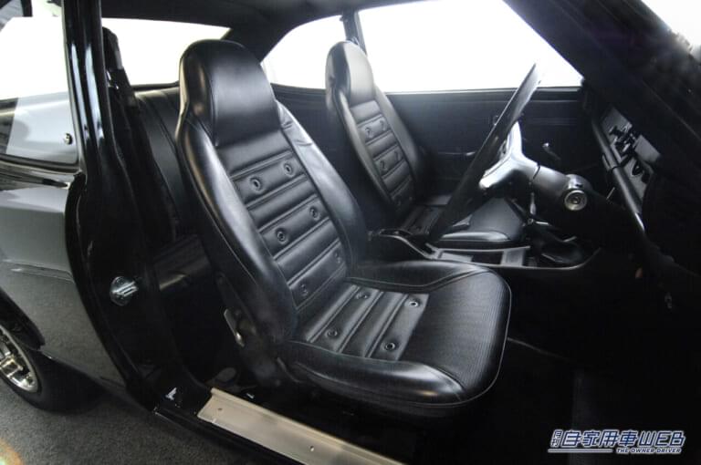 金属バネを使用せず、ゴム板バネとウレタンをクッションとするエアホール付きのシート。前後調整は160ミリ、シートバックはフルリクライニングが可能。フロントシートベルトは3点式を採用、リヤにもシートベルトを備える。なお内装色はこのフルブラックだけだ。