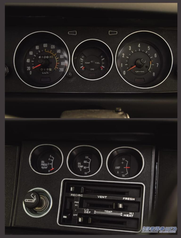 SRの190㎞/hに対し、210㎞/hまで目盛りが増やされたスピードメーター。タコメーターも7000回転からがレッドゾーンになる。オプションのヒーターの上の3連メーターは左から油圧計、油温計、電流計。SRの部分強化ガラスと違い、ウインドウは合わせガラスを採用。