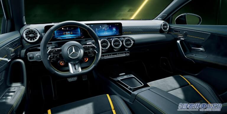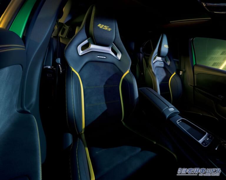 Aクラスとして初採用される外装色AMGグリーンヘルマグノ(マット)、日本限定色となるMANUFAKTURマウンテングレーマグノ(マット)、ポーラーホワイト(ソリッド)の3カラーが用意。エクステリア全体にはイエロー&ブラックのアクセント処理も加わる。