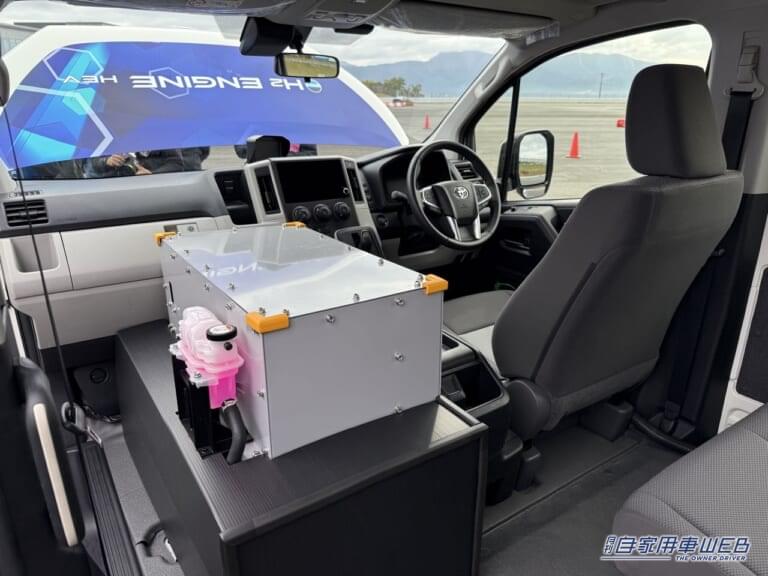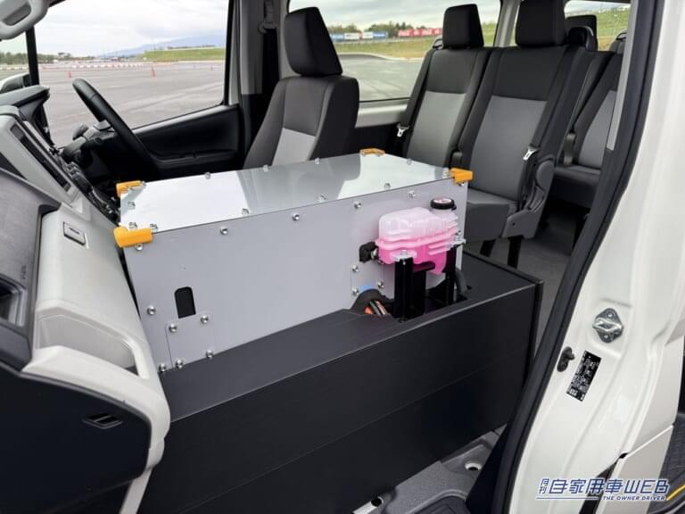水素エンジンとトヨタハイブリッドシステム搭載のハイエースは、助手席スペースにHEV電池を搭載している。