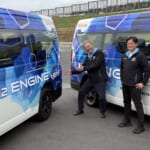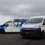 右が水素エンジンを搭載したハイエース。左が今回初公開された水素エンジンとトヨタハイブリッドシステムを搭載したハイエース。水素エンジンハイエースは、2023年10月23日よりオーストラリアメルボルン近郊で実証実験を開始。建設会社や警備会社の運行による走行実証を行っている。