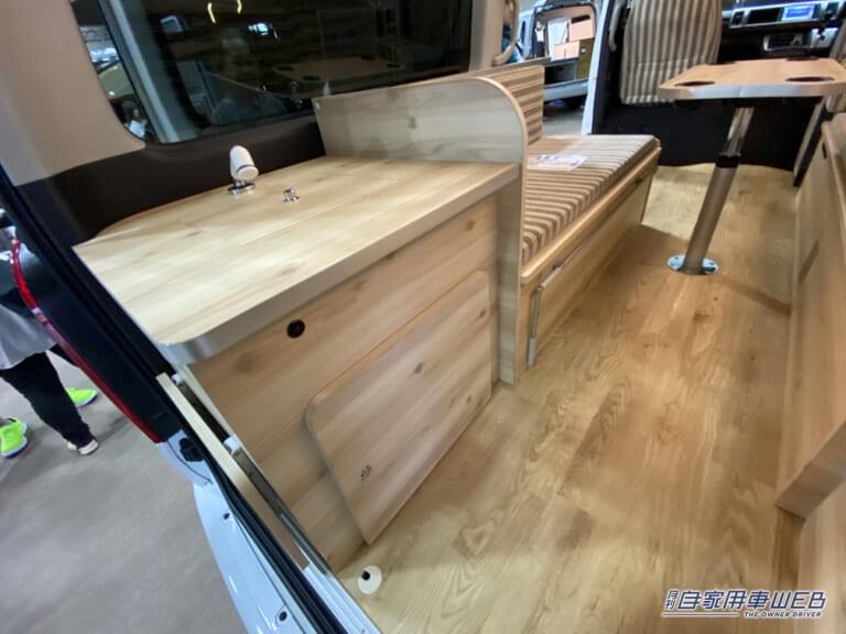 まず目を引くのがシートやソファに施されたストライプ柄。柔らかな色調はストライプという強い柄を和らげ、とても優しい印象。使えば使うほど愛着が湧いてきそうだ。冷蔵庫の上部にはコンセントが用意されているので、電化製品も問題なく持ち込める。