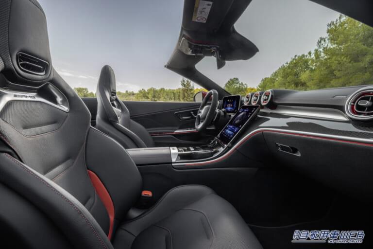 インテリアは、ダッシュボードのトリムや各操作スイッチパネル、ドアパネル、エアアウトレットにアンビエントライト表現を加えることで洗練されたイメージを強化。インテリアトリムは標準でブラックオープンポアウッドインテリアトリムを装備、オプションの AMGダイナミックパッケージを選択すれば、AMGカーボンファイバーインテリアトリムに変更される。