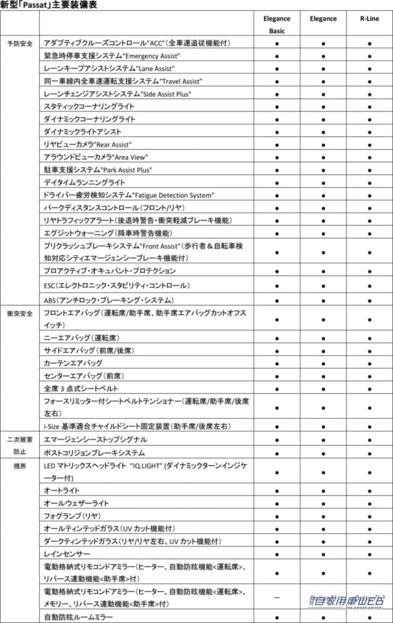 国内仕様のグレード展開は、”Travel Assist”やレーンキープアシストシステム”Lane Assist”、 レーンチェンジアシストシステム”Side Assist Plus”などの最新の運転支援システムをすべて標準装備とした『Elegance Basic』(1.5eTSIのみ)をエントリーグレードに設定。