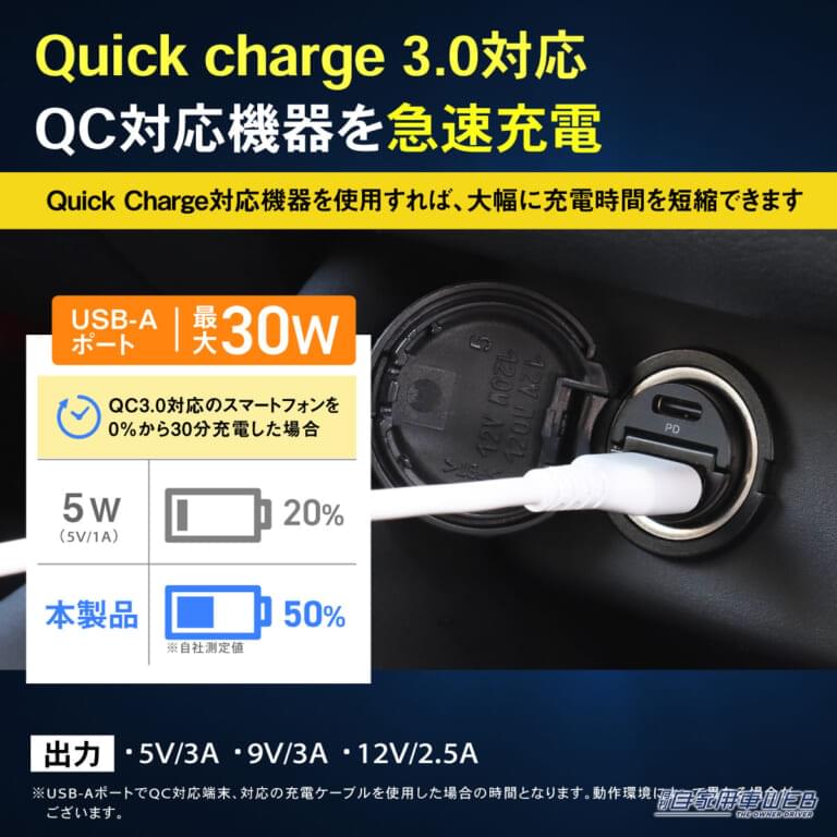 ベルモンドの車載用急速充電器「すっきり埋め込みカーチャージャー君」は、そのコンパクトなボディからは想像できないほどパワフル。Type-CポートはPD対応端末最大30W、Type-AポートはQC対応端末 最大30Wで高速充電が可能となっている。