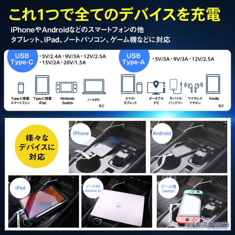 iPhoneやAndroidなどのスマートフォンの他に、タブレット、iPad、ノートパソコン、ゲーム機など、幅広い機器に対応する。また、過電流・過電圧・ショートに対する保護機能も搭載されているので、安心して使用できる。