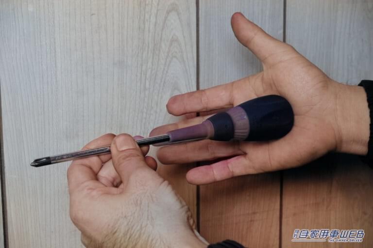 作業時のコツとしては、ネジに対して軸が垂直に立つようあてがい、グラつかないようガッチリ保持しながらグリップ後端をハンマーで強く叩く。万が一の際の備えとして、このドライバーの存在を知っておく、あるいは常備しておくという手もありだろう。