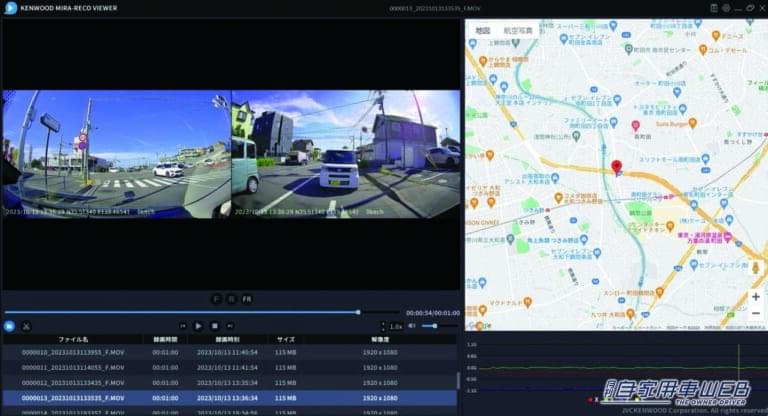 パソコン向けビュワーソフトはWindowsだけでなくMacでも使える。前後の映像が同時見られ、GPSやGセンサーに基づく情報も表示可能となっている。