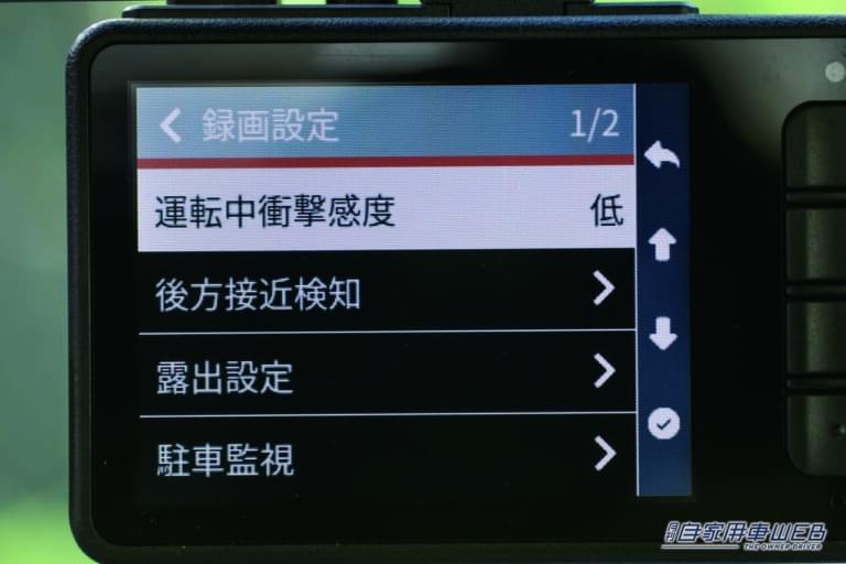 また、後方車両が接近するとドライバーに危険を知らせるとともに自動録画を行うが、走行中のあおり運転だけでなく、停車中の微速による追突にも対応している。駐車監視オプションを接続すれば最大48時間の長時間監視が行え、衝撃検知のほか、のぞき見検知や動体検知も備えている。