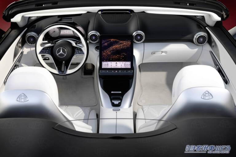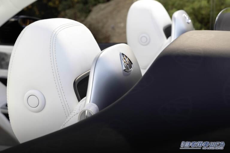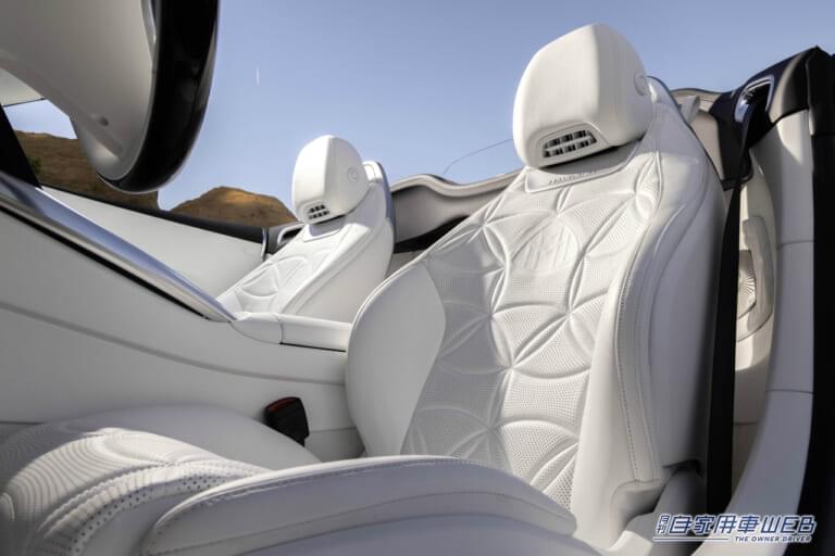 常に環境問題を考慮した製品つくりを行うメルセデス・ベンツらしく、純白の専用クリスタル・ホワイトレザーは持続可能な皮革なめしによって製造。外から丸見えなオープンカーらしく、クローズドルーフの車両では見えないヘッドレスト裏にもマイバッハのエンブレムを装着する。