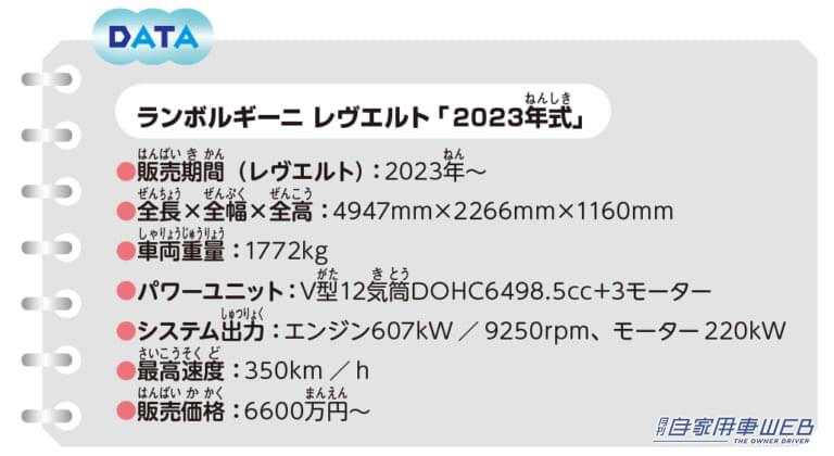 ランボルギーニ レヴエルト2023年式のスペック表。