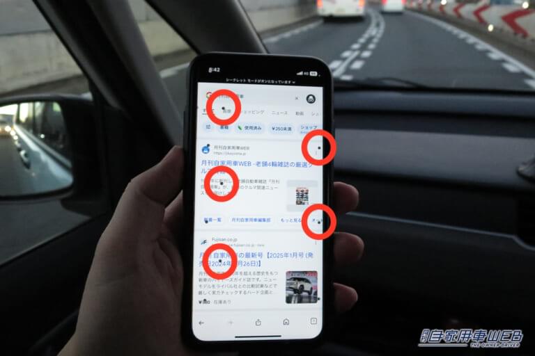 室内で「車両モーションキュー」をONにしても、ただ黒点が現れるだけで、特に変化はないのだが、移動するクルマの中だと、車両の加減速やカーブなどの動きに応じて、目まぐるしく黒点が移動する。乗り物酔いしがちなスタッフが、実際に移動の車内でこの機能を試してみたところ、ほとんど気持ち悪くなることなく、スマートフォンを操作し続けることができた。やはり、それなりの効果はあるようだ。