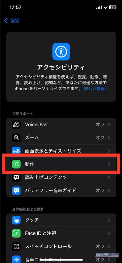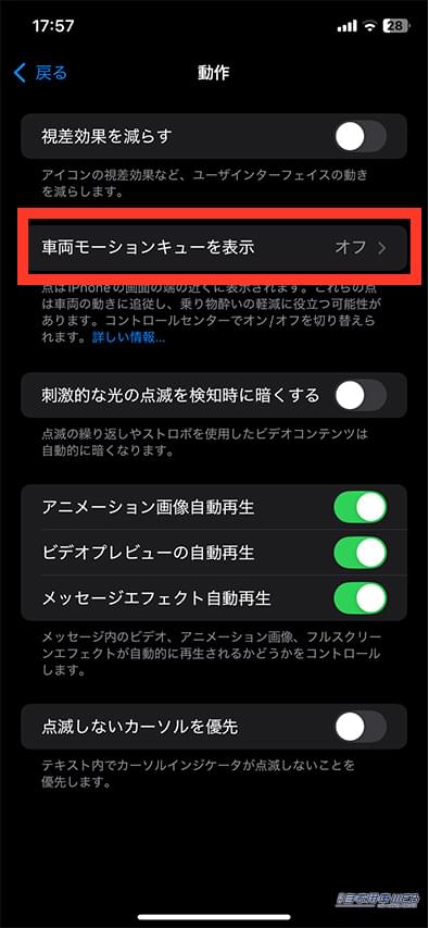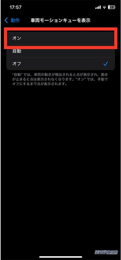 「車両モーションキュー」機能をONにすると、画面の端に黒点が現れる。