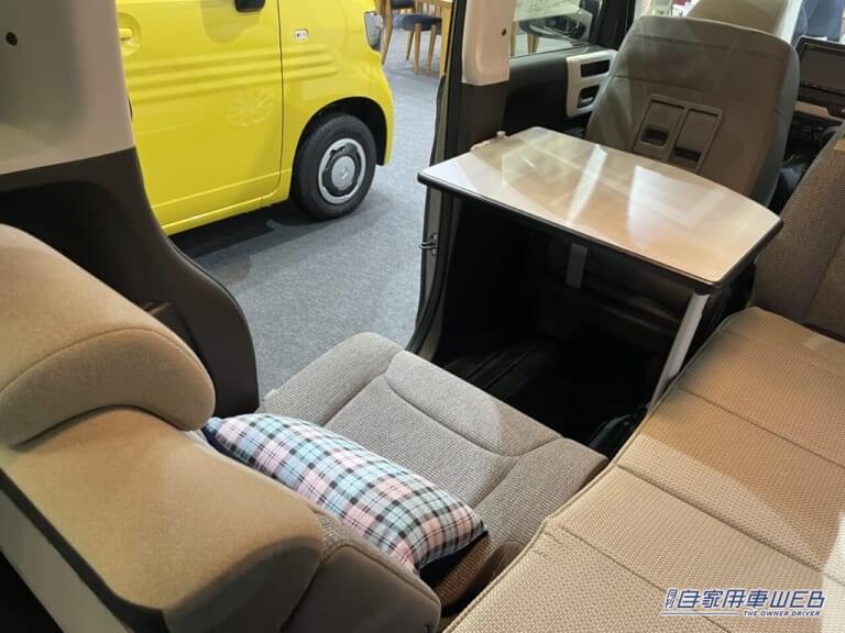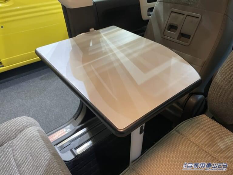 車内はフラットになったシートとテーブルというレイアウト。助手席の後ろに設置されたテーブルは、簡単な作業やデスクワークをするには便利な仕様だ。キャンプだけでなくリモートワークで利用するのも良さそう。たとえば家の中がうるさい環境であれば、さっと車内に移動してリモート会議なんてことも。