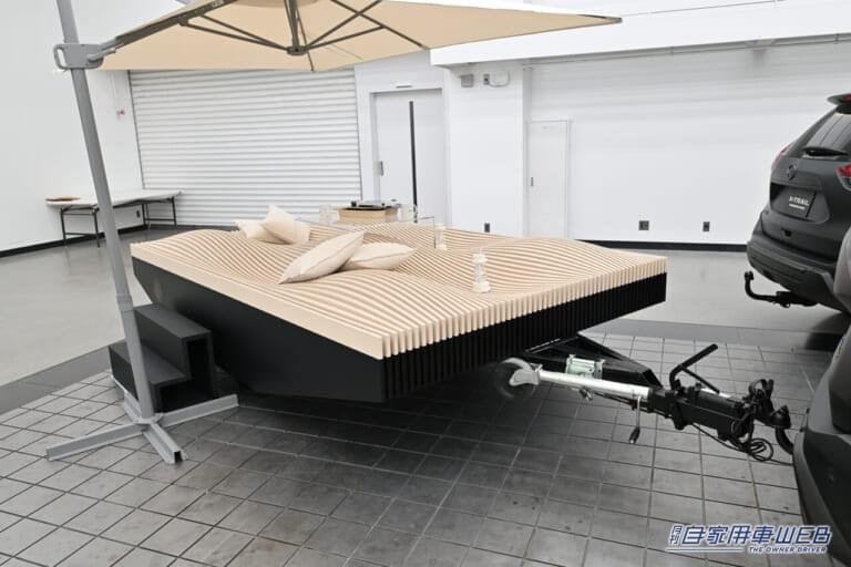 まず、現行エクストレイル(T33)をベースとする「X-TRAIL unwind concept」は、荷室に「5」の文字をモチーフとするラゲッジラックと、簀子テラスを載せたトレーラーがポイント。さらにラック下段にイタリアのエスプレッサマシンメーカー・ランチリオ社が監修したエスプレッソマシンを置くことで、「父」がインドア/アウトドアを問わず、本格エスプレッソが楽しめる贅沢な空間を目指したという。