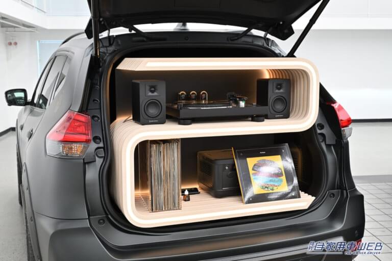 もう一台の先代エクストレイル(T32)をベースとする「X-TRAIL remastered concept」は、「2」の文字をモチーフにしたダブルラックの上段にオーディオテクニ社が監修したアナログレコード機器を設置。「息子」が音楽を楽しめる自由な移動空間をイメージしたことに加え、中古車カスタマイズという新たな中古車の楽しみ方の提案もこめられているそうだ。