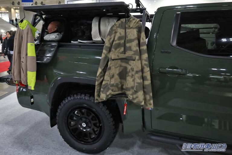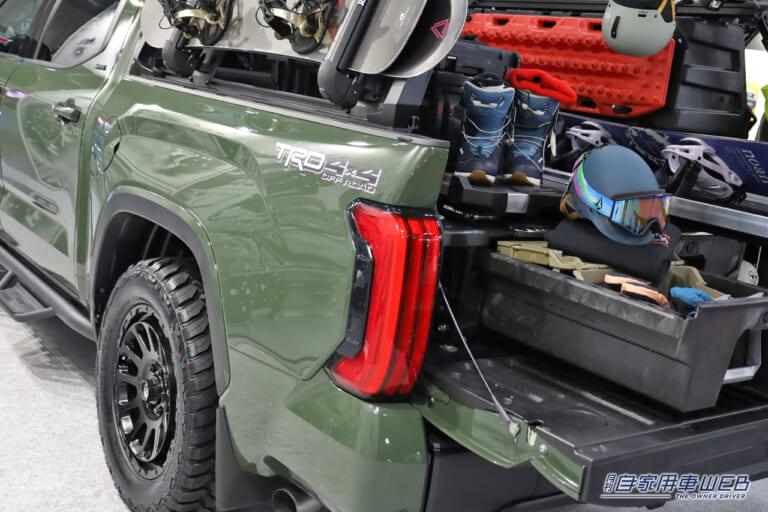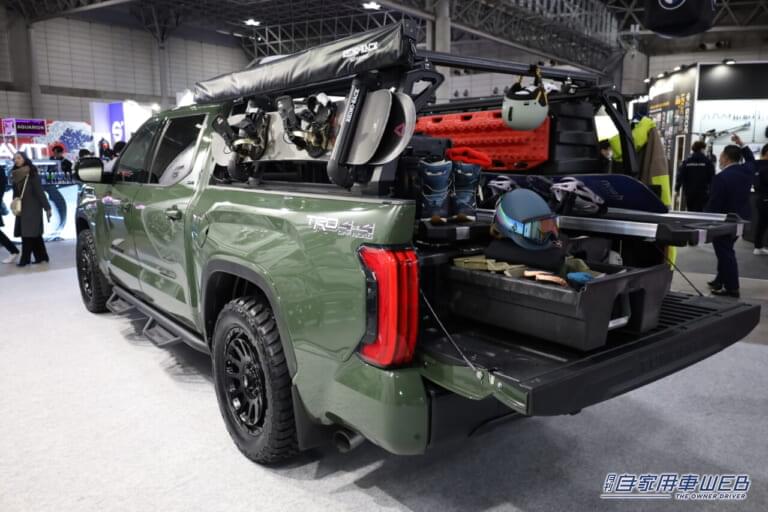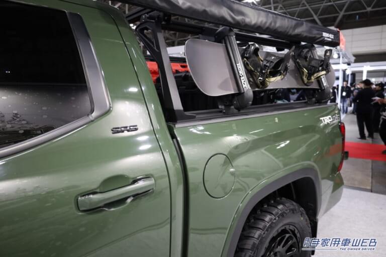 展示されていたタンドラは、EXIZZLE-LINEという自動車用品のインポーターが出展していたもので「ウィンタースポーツを楽しむ」というコンセプトでカスタマイズがほどこされていた。