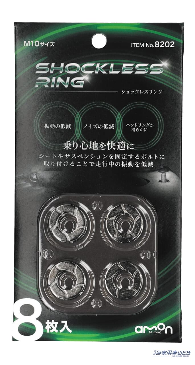 一般の金属とは異なる原子の規則相と不規則相が存在する“特殊制振合金”を採用した金属製のリングで、シート取付ボルトやサスペンションアッパーマウントのボルトに挟み込むだけで、効果が得られるというもの。この素材は、高い寸法精度が求められる工作機械(マシニングセンタ)内部や基盤の微振動除去に使用されている。