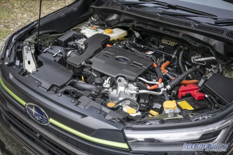 ストロングハイブリッド車には、2.5L水平対向4気筒エンジンに2つのモーターを組み合わせた「S:HEV」を搭載。このシステムはクロストレックでも導入されているスバルの最新ハイブリッドで、高速走行時に優れた性能を示すシリーズパラレル方式を採用。従来型のハイブリッド車(e-BOXER)に比べて動力性能と燃費性能の大幅な向上が見込まれる。1.8Lターボ車は、従来型でも採用されていたCB18型水平対向4気筒直噴ターボを引き続き搭載する。なお、駆動方式は全グレードともAWDモデルとなる。