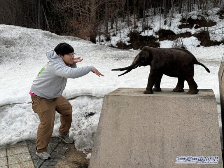 サービスエリアではしゃぐ余裕も。福重「ナウマンゾウのポーズです!」