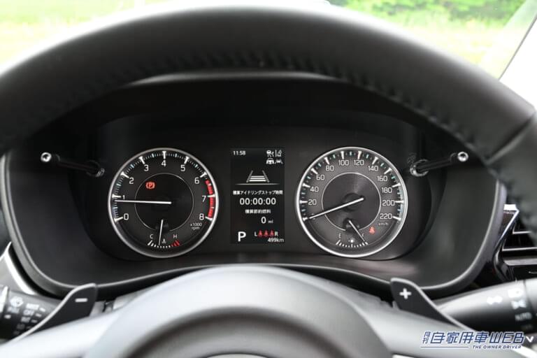 シフトはオーソドックスなストレートタイプ。その後端には電動パーキングブレーキ、ステアリングにはパドルスイッチが配置される。スピードメーターは中央にインフォメーションディスプレイを配置するタイプ。
