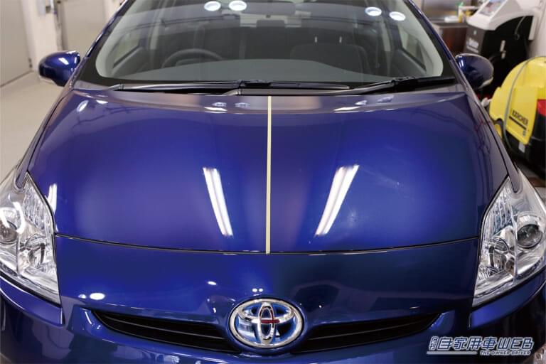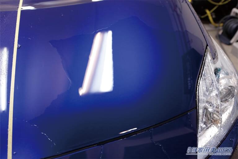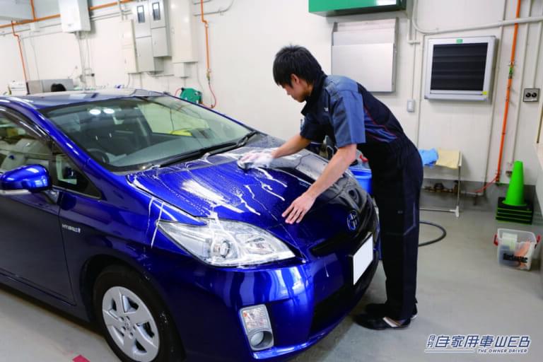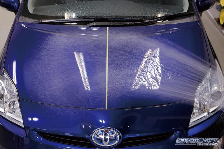 ワックスとコーティング剤の比較検証に使用するのは、トヨタのプリウス。ボンネットを二分割して、それぞれ施工していく。その前に、ボディ表面を入念にチェックされ、シャンプで洗浄。さらに、ねんど処理で鉄粉などの除去も行い、イコールコンディションになるように配慮した。
