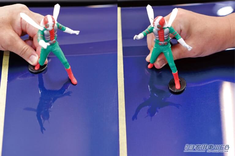 コーティング剤とワックス、それぞれの映り込み具合から比較していこう。まずは、下の写真を見ていただきたい。