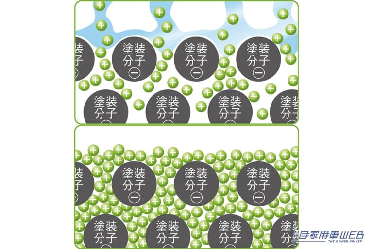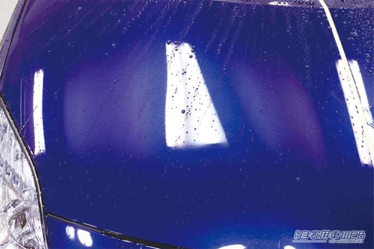 まず、ワックスは水滴が玉になり、コロコロと転がっていくのに対して、コーティング剤は水がまとまってサッと引けしていく。滑水や疎水などと表現される水はじきだ。