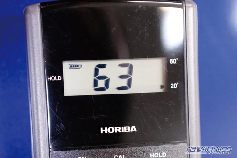 次に検証するのは、光沢度計という計測機器を使用した、光沢具合の比較だ。ちなみに、施工前の光沢度は63だった。