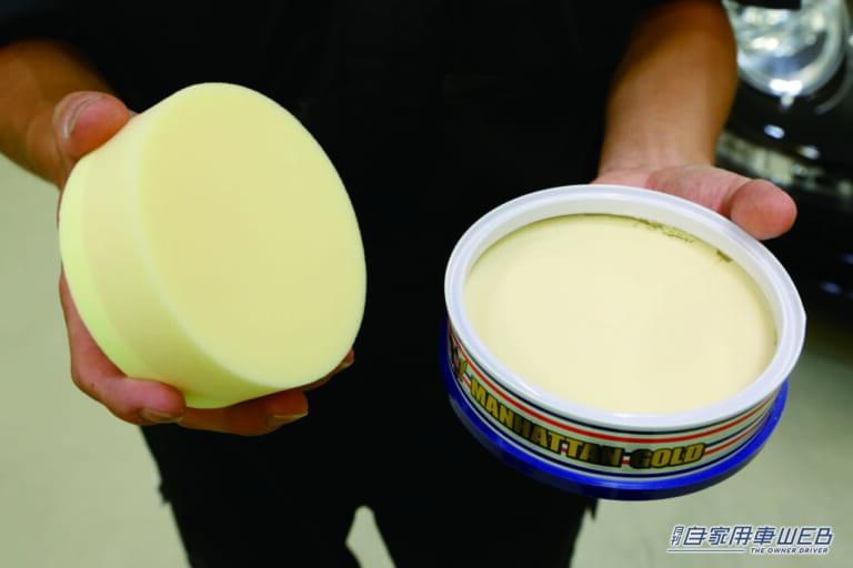 続いて作業するのはワックス、マンハッタンゴールドJr.だ。ワックスを塗布する際の注意事項は、専用スポンジにほんのわずかにワックスを取ること。沢山取るのはNGだ。目安としては、ワックス上に置いたスポンジを1/4回転する程度。これで十分な量がスポンジ側に付着してくれる。