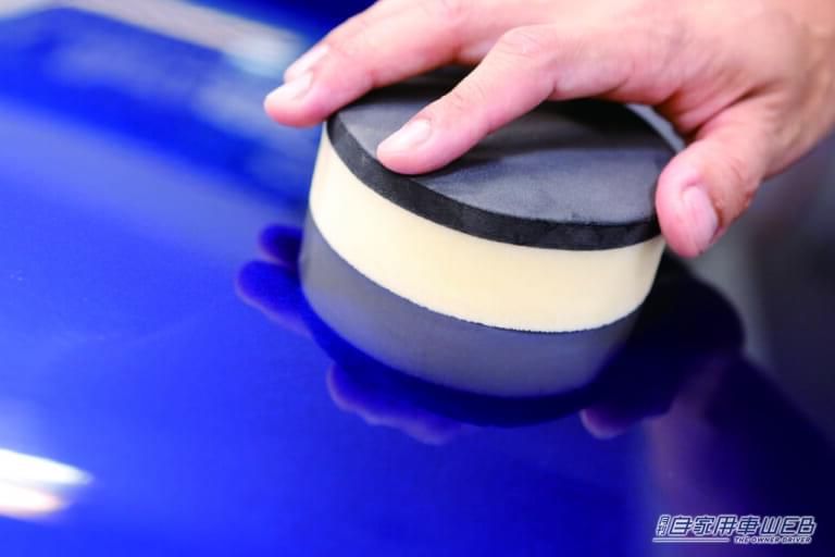 スポンジにワックスを取ったら、まずは、ボディ表面にポンポンとのせるように塗布していく。この際、均等な幅で、なおかつスポンジが変形しない程度の力加減で塗っていくことが重要。次に、同じスポンジでワックスを全体に塗り伸ばしていく。
