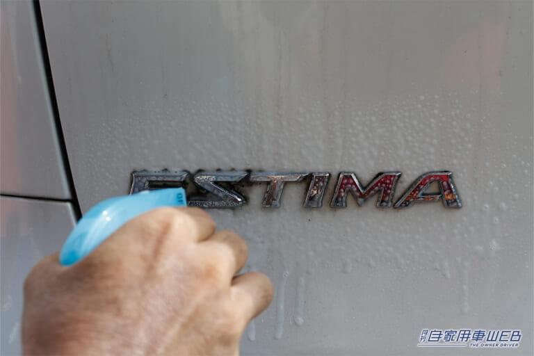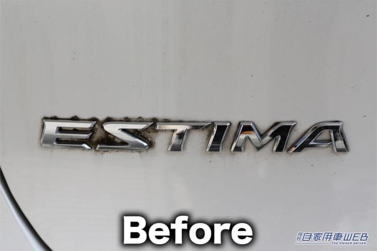 通常の洗車では汚れを落とし切れないのがエンブレム周辺。放置しているとこのように黒ずんだ汚れが溜まりがち。「これは汚い…」と、思わずつぶやいてしまうほどだ。