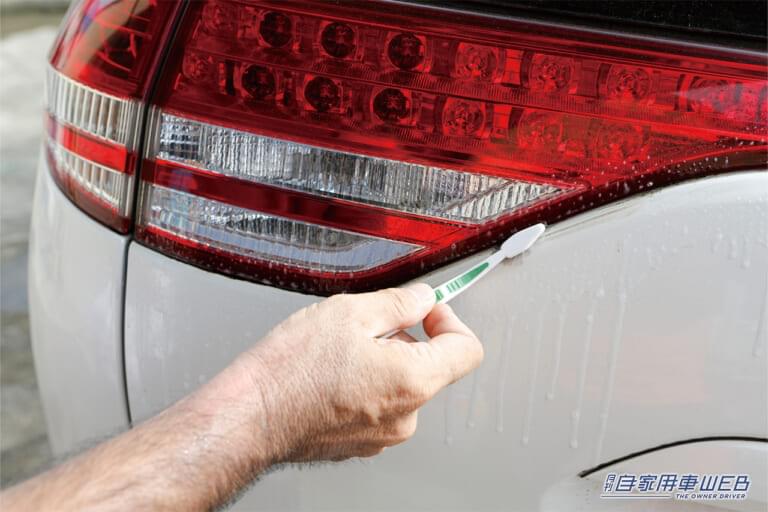 こういった細部をキレイにするだけで、愛車の印象は大きく変わってくる。ランプの端とボディが接する面に生じたわずかな隙間にたまった汚れは、使い古しの歯ブラシが活躍してくれる。