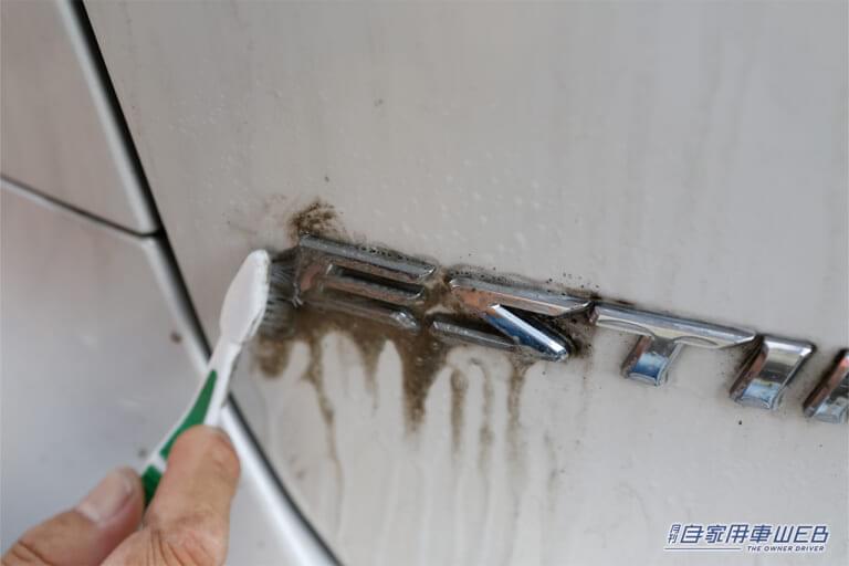 ここでも活躍するのは歯ブラシだ。エンブレムとボディの隙間に毛先を押し込むようにこすることで、汚れの正体である水アカをしっかりと落としていく。水アカクリーナーとの相乗効果で、黒い汚れがみるみると落ちていく…。