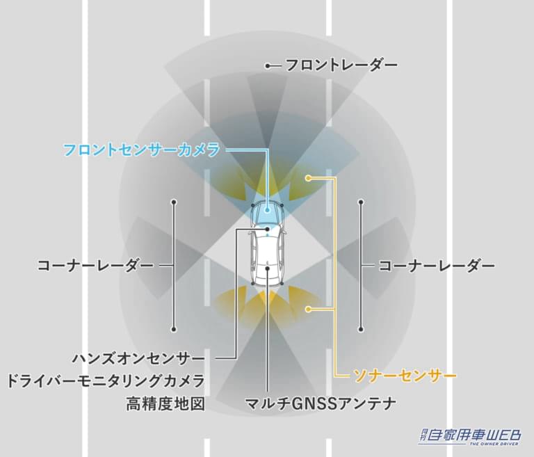 ドライバーモニタリングカメラ、高精度地図、マルチGNSSアンテナなどを採用し、ドライバーの状態確認や、車両の制御機能が向上。ドライバーの運転負荷を軽減して、予防安全機能が拡大されている。
