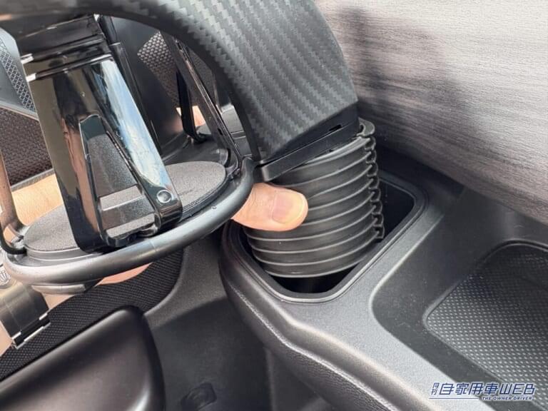 これで設置完了。ひとつ穴のドリンクホルダーにふたつのドリンクを入れることができる。デザインはカーボン調でスタイリッシュだ。車内のドレスアップにもなる。
