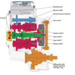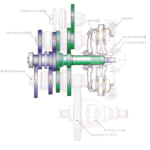 VW乾式7速DSGの二つのクラッチとギヤ配置。偶数段が図で紫色に区別されたクラッチに、奇数段が緑色に区別されたクラッチに接続され、交互に変速を繰り返す。VWは7速だが、ホンダは9速を実用化している。