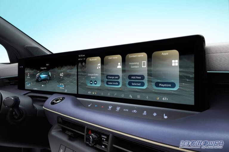 前席のフットスペースは、エアコンユニットをモータールーム内に移動させることで大幅に拡大。インパネは、大型ディスプレイを2つ並べたクリーンなデザインを採用することで、未来的な印象を与えつつも、インフォメーション表示や操作のしやすさを両立している。