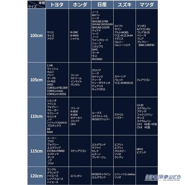 VANIワンタッチサンシェードは、車のフロントガラスのサイズに応じて6サイズを展開している。100cmから125cmまで、5cm刻みで選べるため、自家用車からミニバン、SUVまで幅広い車種に対応できる。