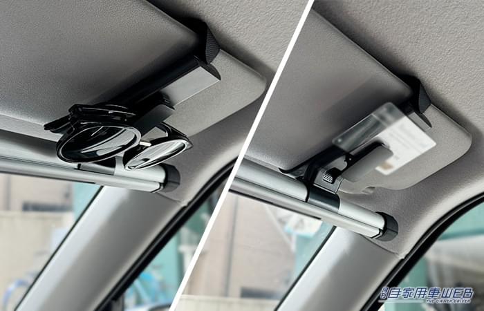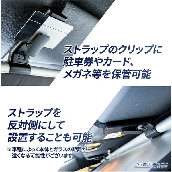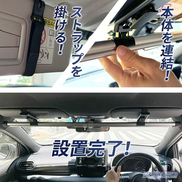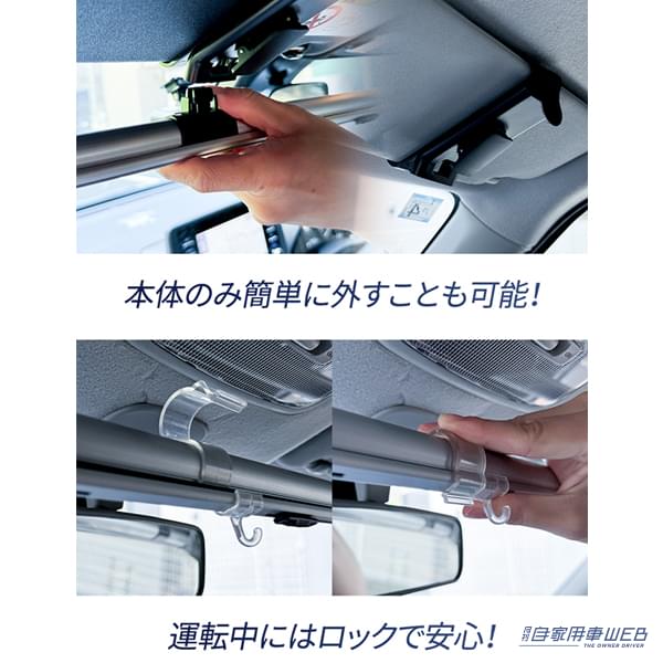 固定方法は、サンバイザーにベルトを通して固定するだけ。吸盤のように気温に左右されることなく、安定して固定できる。しかも一度設置してしまえば、毎回取り外す必要もない。ドライブ中の視界も邪魔せず、設置時もスッキリとした見た目を保てるのも嬉しいポイントだ。