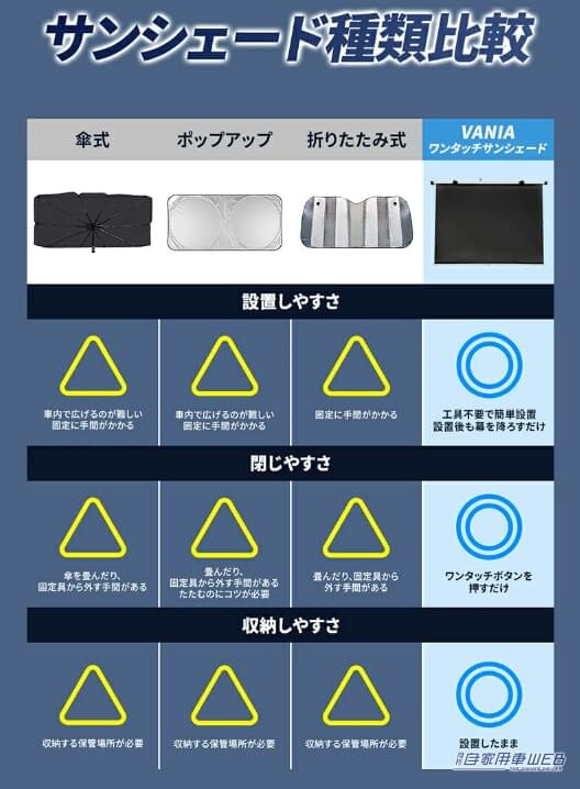 傘式やポップアップ式は展開や収納に手間がかかる上、収納時に場所を取る。特に傘式はダッシュボードやナビに接触して傷をつけるリスクもある。その点、ロール式のVANIワンタッチサンシェードは、こうした課題をすべて解決している。