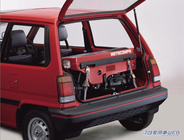 シティの荷室にすっぽり格納できるモトコンポは8万円。全長×全幅×全高は1185㎜ ×535㎜ ×910㎜ 、車両重量は45㎏ 。2.5PSの49㏄ エンジンを積み公道も走れる。燃料タンク容量は2.2ℓ。ホンダはシティで4+2ドライブの楽しさを提案。2001年の2代目ステップワゴンにも車載用電動アシスト自転車「ステップコンポ」を設定した。