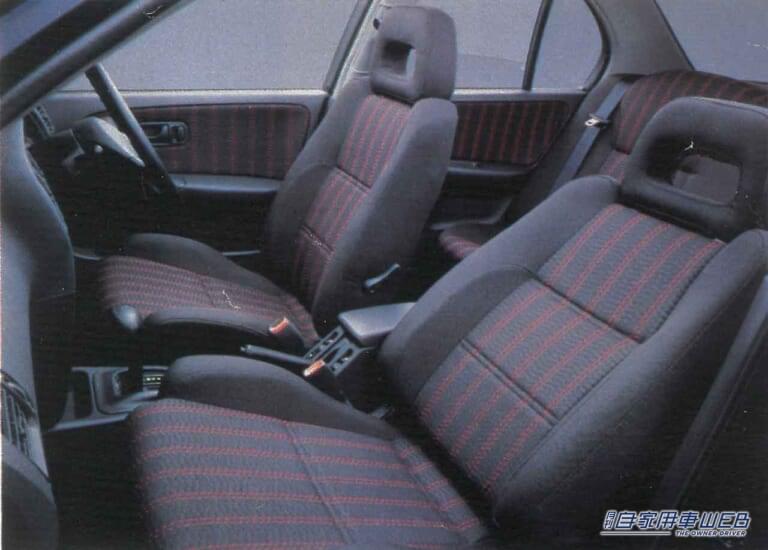 2.0TeとTsに採用されるオフブラックに赤いステッチのスポーツシート。穴あきヘッドレストは前後調整が可能。スポーツシートはシートバックの肩部分にワイヤーフレームを入れ、よりホールド性を高めている、またスポーツシート以外はエルゴノミックシートと呼ばれ、人間工学に基づきサイド部のクッションを座面より20 ~ 50%硬くしている。