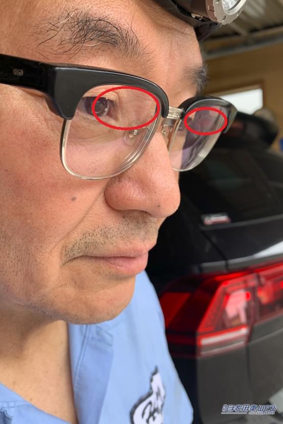 クルマのメンテナンスでは、写真のように上を見上げる作業が意外と多い。加齢により老眼が進むと、遠近両用レンズのメガネが重宝するが、実際の作業では不便に感じることが多くなるわけです。なぜなら、一般的な遠近両用レンズは、遠くを見る部分が上側、近くを見る部分が下側に配置されているから。しかし、メンテナンス作業では、上を見ながら細かい作業を行う場面も少なくないため、近くを見るためのレンズが上側にないと、作業が非常にやりにくく感じることが多くなってきた。