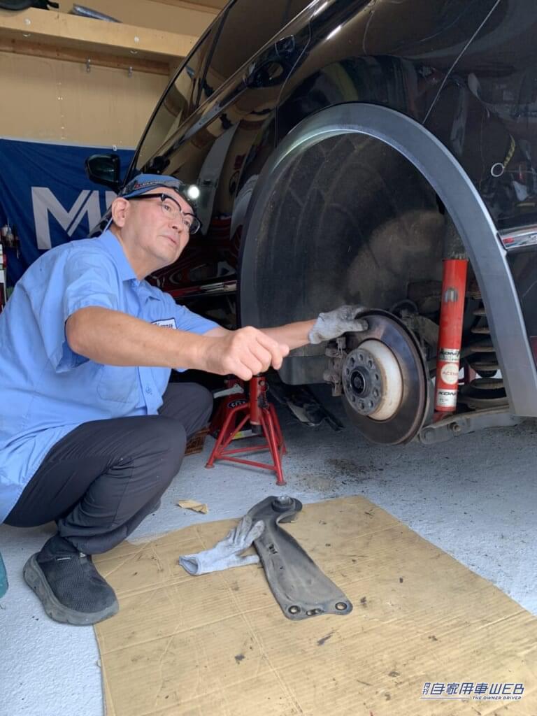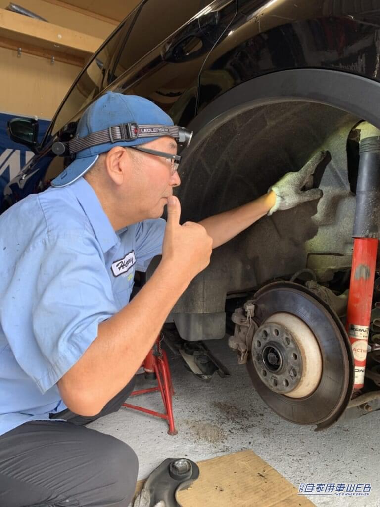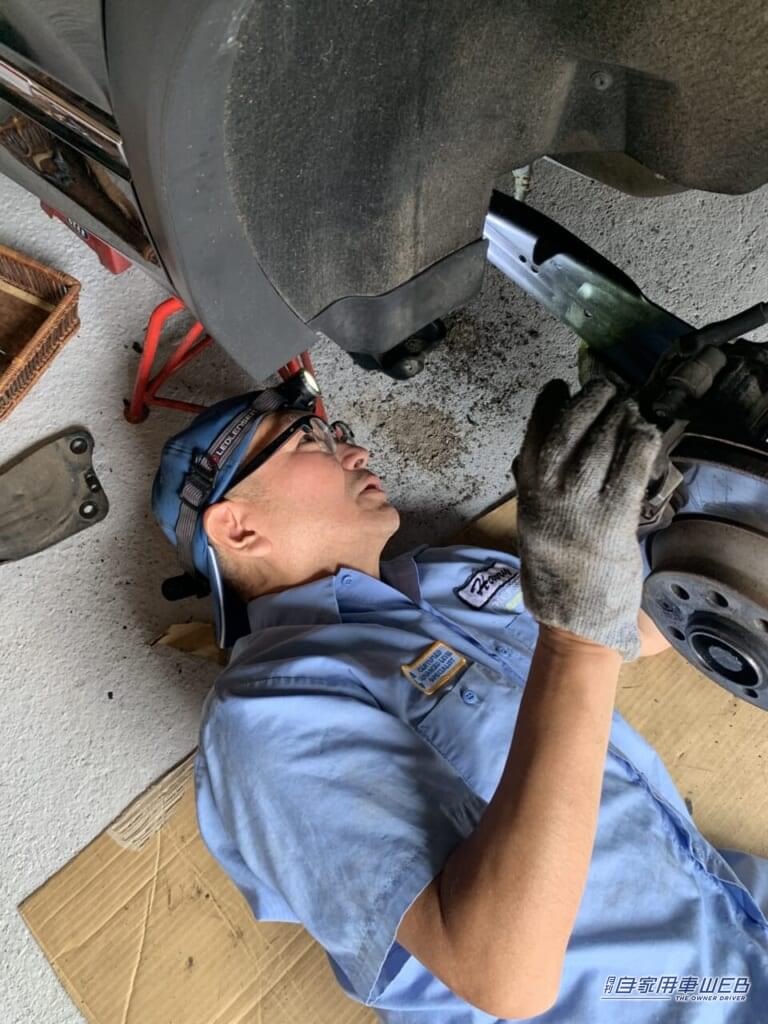 リヤサスのショックの上部点検や、クルマの下に潜り込んでの作業を行う時は、これまで顎を上げたり、無理な姿勢で覗き込んだりする必要があったのだが、この逆遠近両用メガネなら、視線を上げるだけで近くの対象物にピントが合ってくれる。当然、無理なく楽な姿勢で作業ができるようになった。これは本当に嬉しいポイントです。