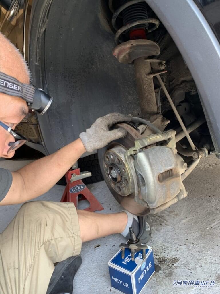 ジャッキスタンド(リジッドラック)を使ったDIY作業では、作業箇所と目の距離が近くなるため、老眼にはつらい。この写真のようにトレーリングアームの車体取り付け部を上目遣いで見る際には、逆遠近両用メガネのメリットが大きく感じる。ただ、視線を頻繁に動かす作業となると、度数が大きく異なる遠近両用レンズ特有の慣れも必要になりそうだ。