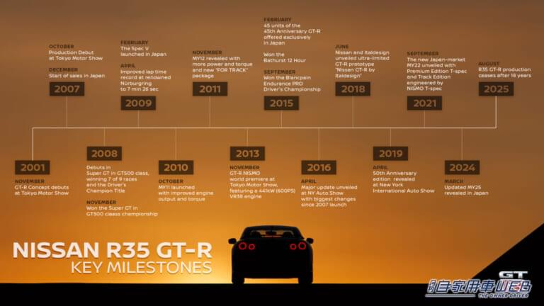 2007年のデビューから始まり、ニュルブルクリンクでのラップタイム更新、数々のレース優勝、そしてモデルイヤーごとの進化、そして2025年に18年間の生産を終えることが記されている。このタイムラインは、GT-Rがいかに継続的に進化してきたかを教えてくれる。
