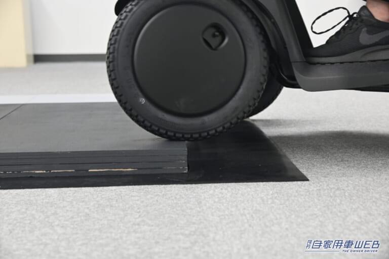 それでいて加速は非常に力強い。路面の段差は高さ7.5㎝、幅10㎝まで乗り越えることができるとのこと。8インチのフロント大径タイヤは空気入りで、乗り心地も良好。車両重量は64㎏もあるため、安定感は抜群。姿勢を崩しても、倒れるような気配は一切なかった。