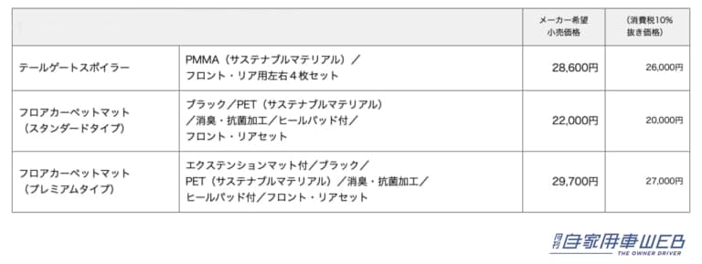 また、他にもホンダアクセスでは、純正アクセサリーの「フロアカーペットマット」において、従来のポリプロピレン素材に対し、サステナブルマテリアルであるリサイクルPET素材への切り替えを行っている。これにより、原材料製造時のCO2排出量の削減が見込まれ、さらにフロアカーペットマットとしての使用が終わった後のリサイクル性にも配慮することで、将来の循環型社会へも対応が可能になる。もちろんN-ONE e:においてもサステナブルマテリアルを採用した「フロアカーペットマット」をラインアップされている。
